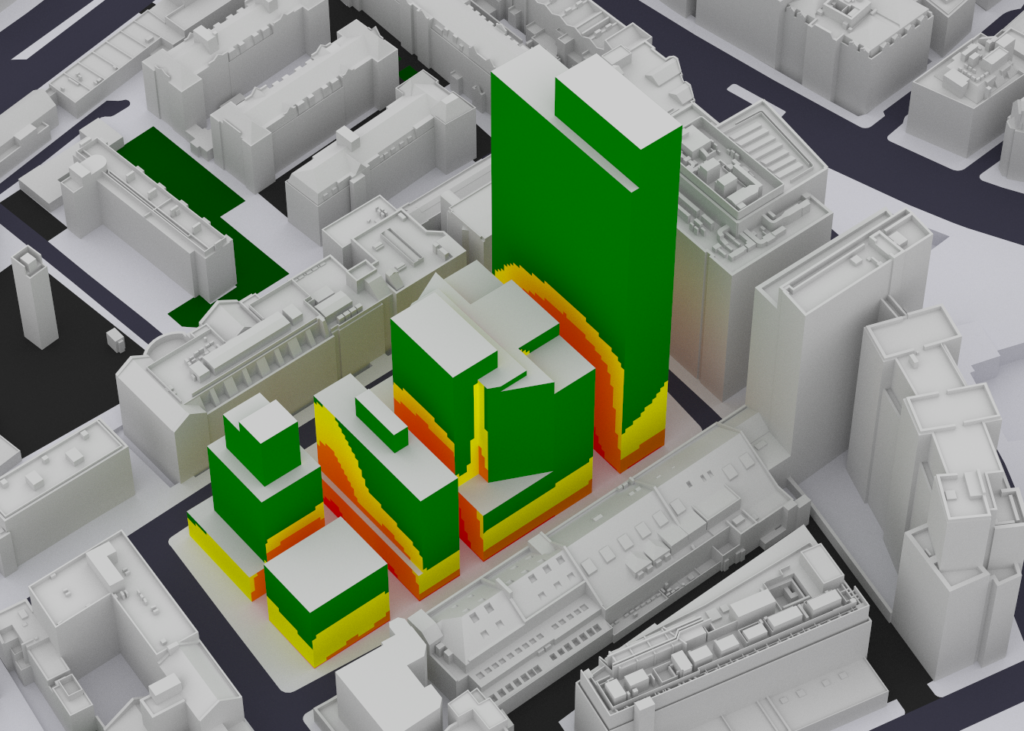 An envelope allows you to understand the massing potential of the site. An envelope can be built to comply with the planning guidelines, as well as Rights of Light. These can be combined envelopes or separate envelopes.
